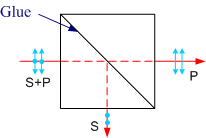 偏振分束立方體 將隨機(jī)偏振光束分成兩束正交的線偏振光,S偏振光以90度角反射,P偏振光透射,每個分束器由一對精密高公差直角棱鏡膠合而成,其中棱鏡的斜邊鍍有介質(zhì)分光膜。
